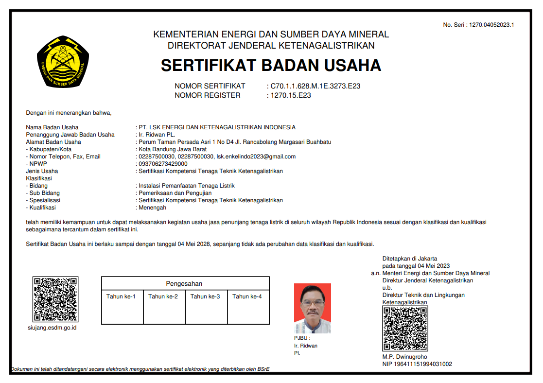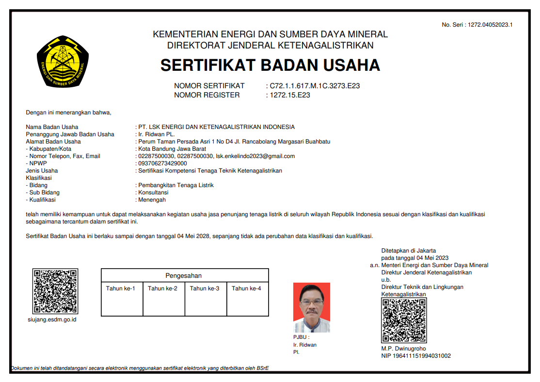 Berikut adalah legalitas Sertifikat SBU dan ISO PT. LSK Energi dan Kelistrikan Indonesia